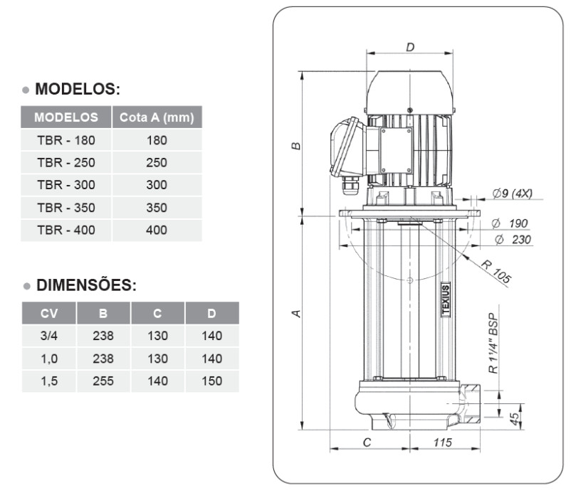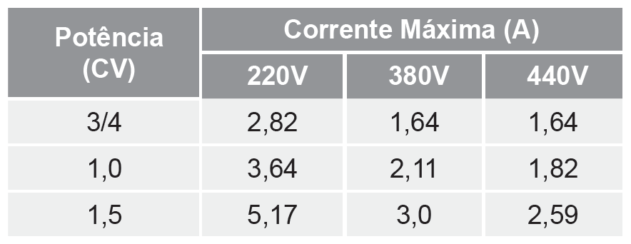 • Potência: 3/4CV - 1,0CV - 1,5CV