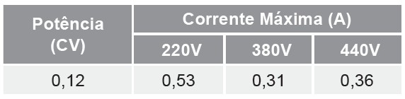 • Potência: 0,12 CV – 0,09 kW